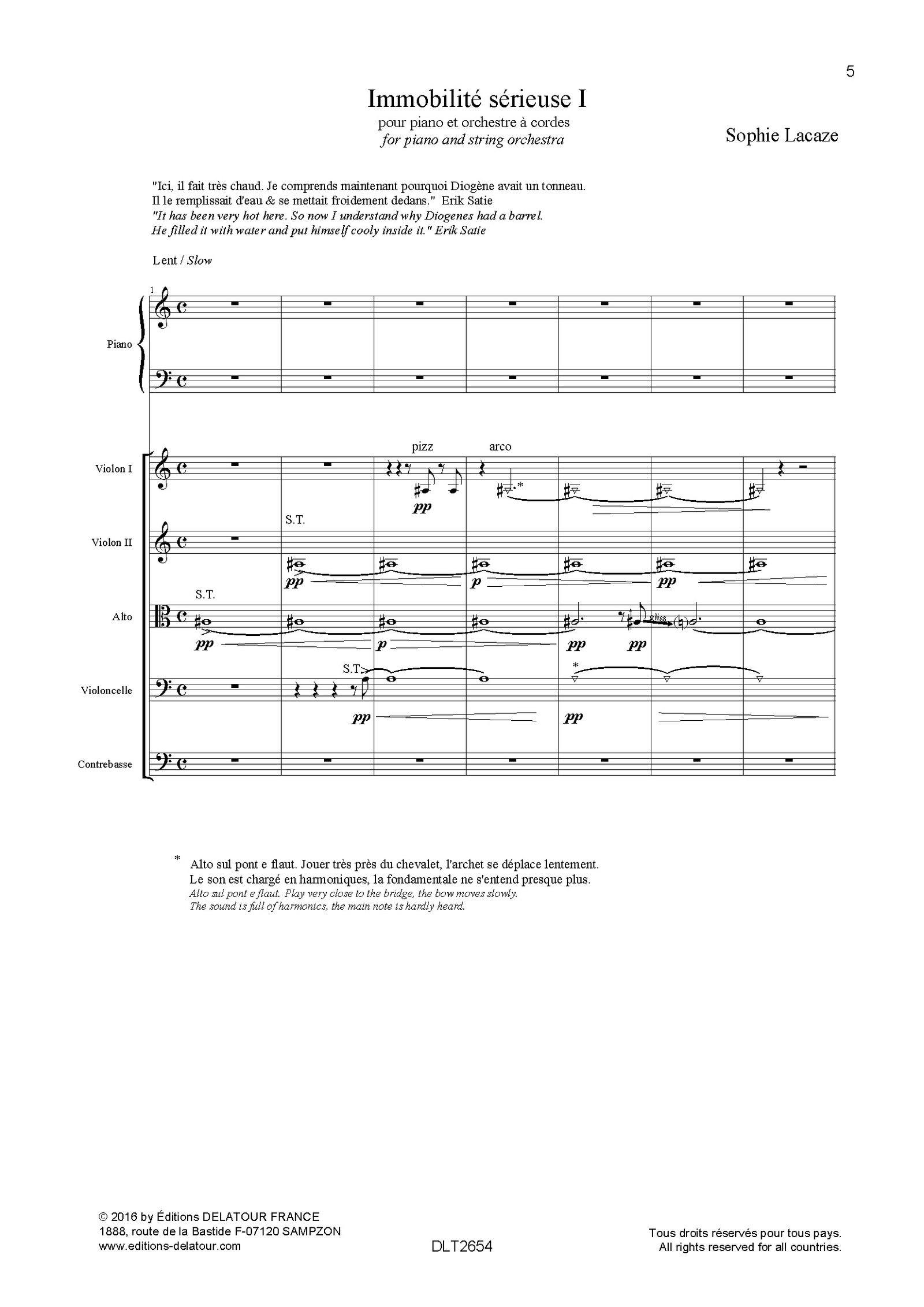 « Immobilité sérieuse I » (« Serious immobility 1 »), written in 2013, is the first piece of a series of works for solo instrument and string orchestra by Sophie Lacaze. Homage to Erik Satie, « Immobilité sérieuse I » is based on a pattern from Satie’s work « Vexations » that was composed for the piano. « Vexations » was premiered in New York by John Cage and several of his friends on Sophie Lacaze’s day of birth.