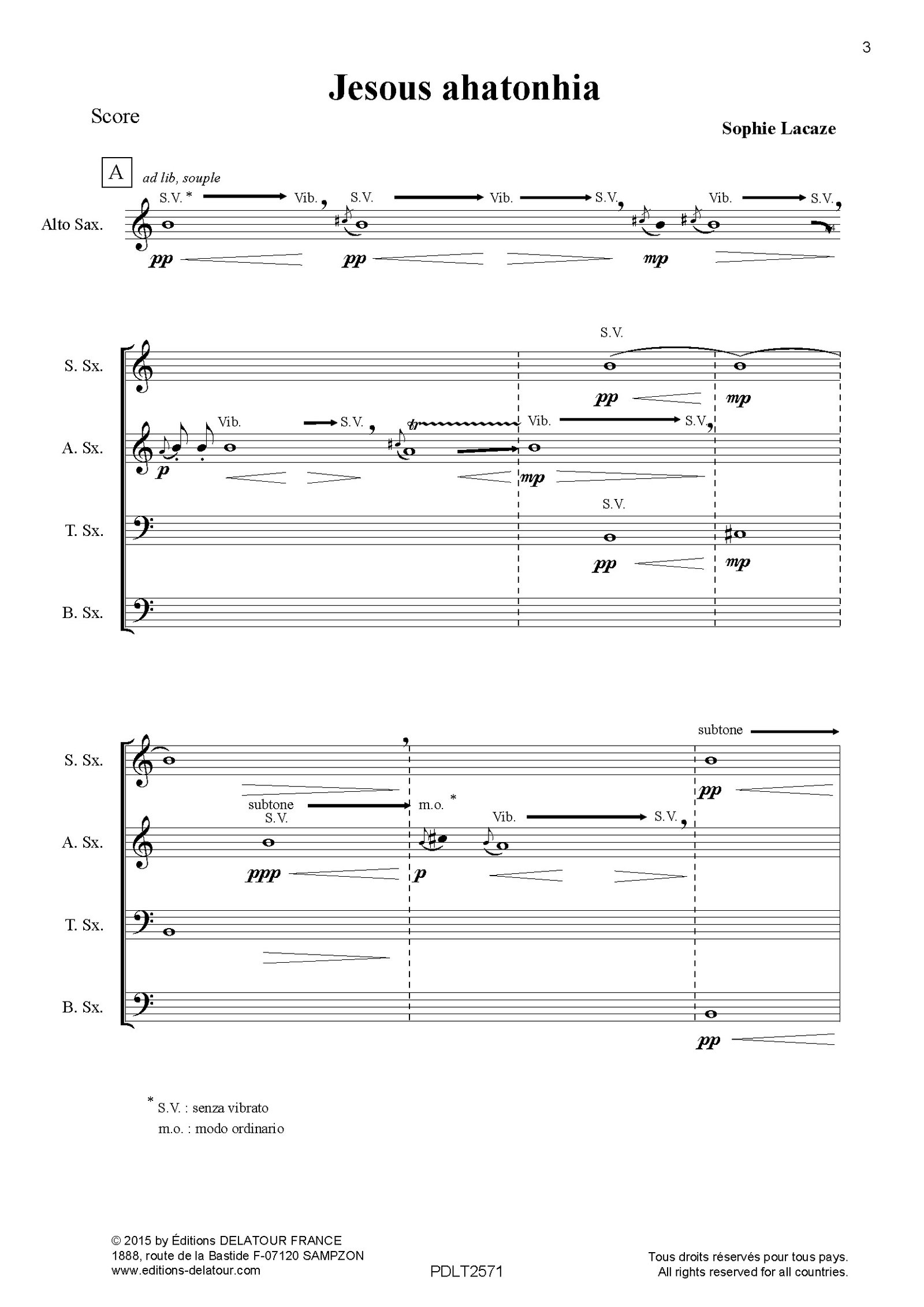 « Jesous ahatonhia », for saxophone quartet, was commissioned by the Fondazione Adkins Chiti: Donne in Musica for its concert series ControCanto: Natale in Musica in Italy in 2013. It was premiered in Roma on December 18, 2013, by Kommandaria Sax Quartet.