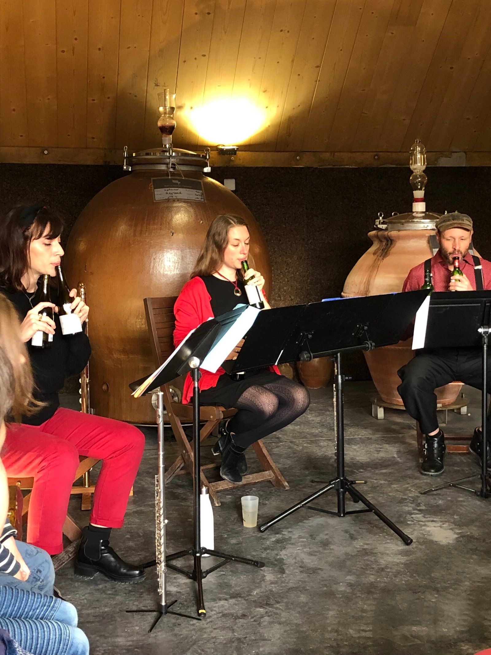 Recording of « L’âme du vin » for two flutes, clarinet, and bottles, for the production of a CD single in association with a bottle from the Grange Tiphaine.