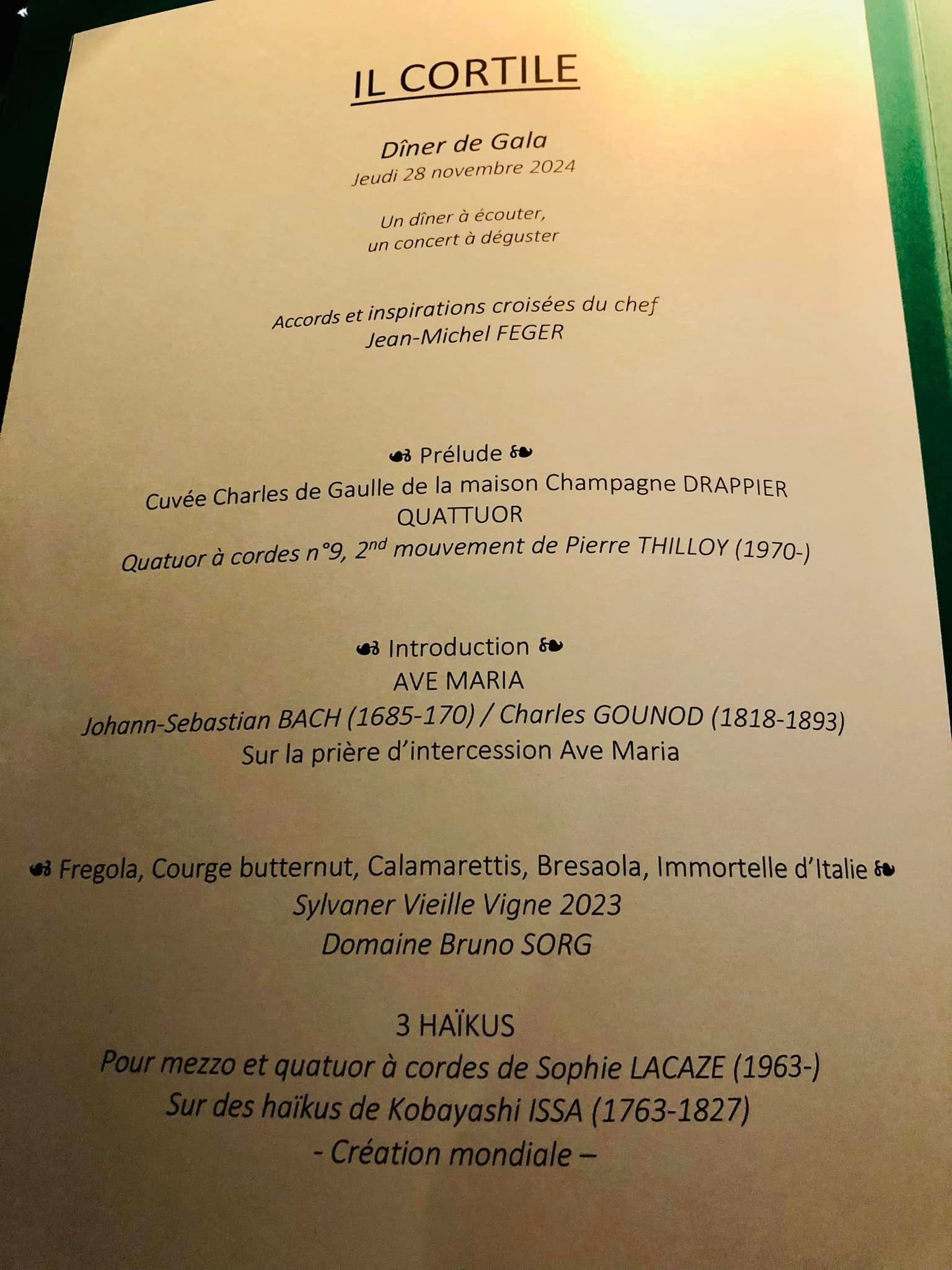 Un papillon s’envole Concert 28 novembre 2024 Il Cortile, Mulhouse, France Marie Le Normand (mezzo-soprano), Quatuor Aegon Concert gastronomique dans le cadre de la Journée Musiques & Créations organisée par le SNAC (Syndicat National des Auteurs et Compositeurs).————A gastronomic concert as part of the Journée Musiques & Créations organised by the SNAC (Syndicat National des Auteurs et Compositeurs).