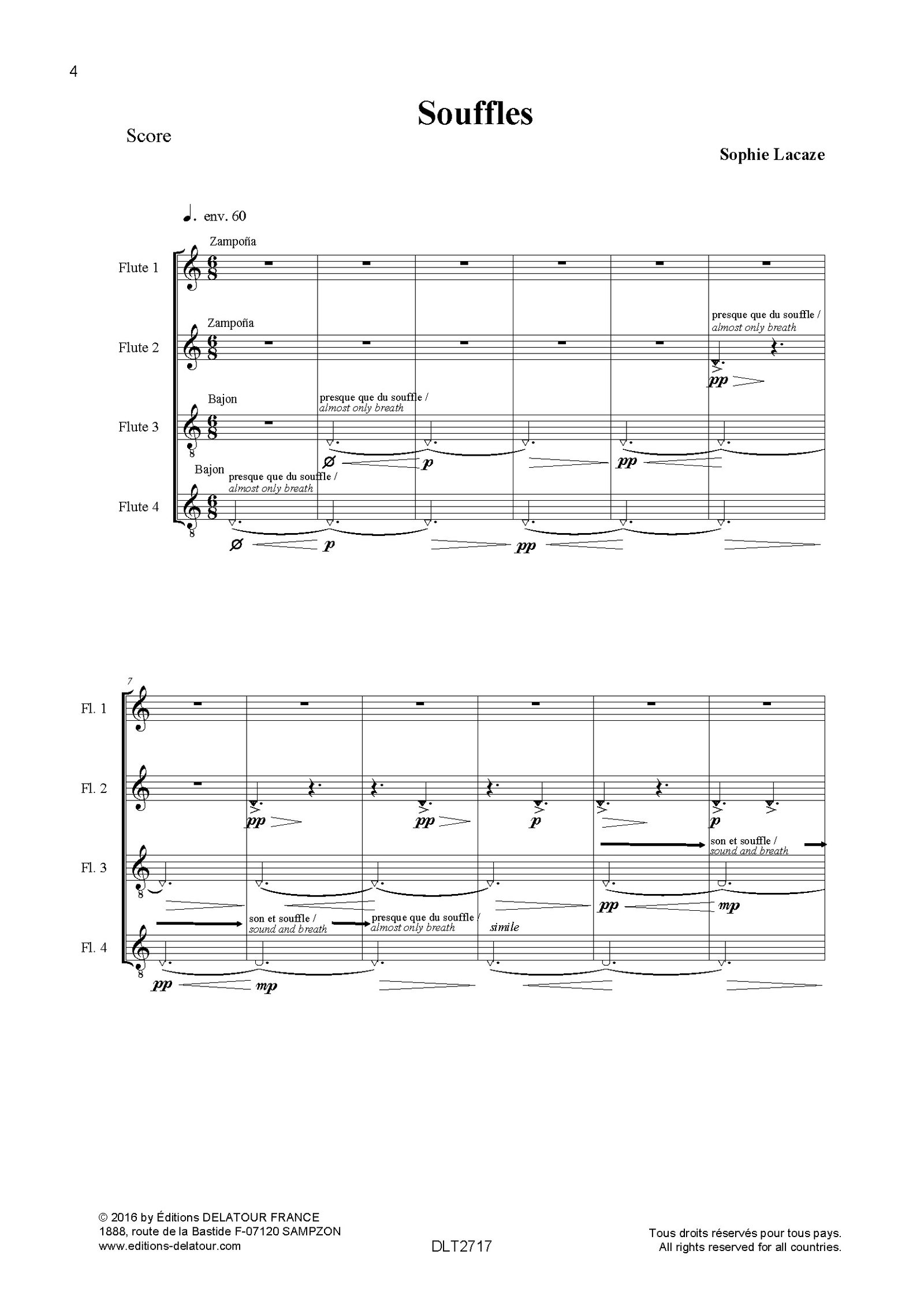 « Souffles » is a work composed by Sophie Lacaze at the request of the Antara ensemble (Chile), for four flutists playing both Western concert flutes (C flute, alto flute, and bass flute) and traditional South American flutes (zamponias and bajones).